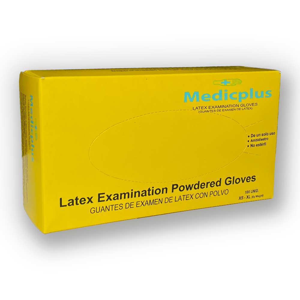 Guantes de examen de látex con polvo de la marca Medicplus. Están diseñados para brindar una barrera de protección en procedimientos médicos y exámenes.